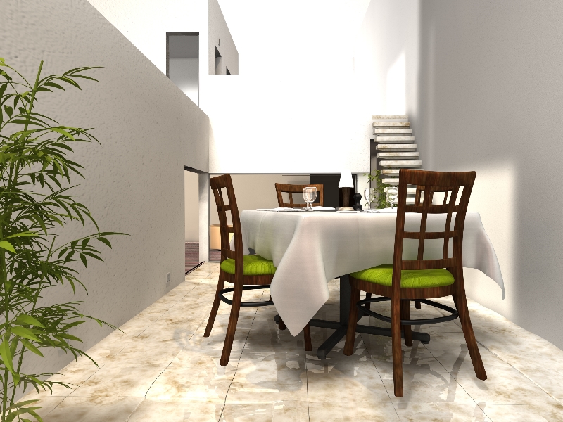 Allerdings scheinen die Moebel zu schweben, weil die Schatten unter den Stuhlbeinen durchgehen.