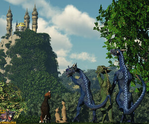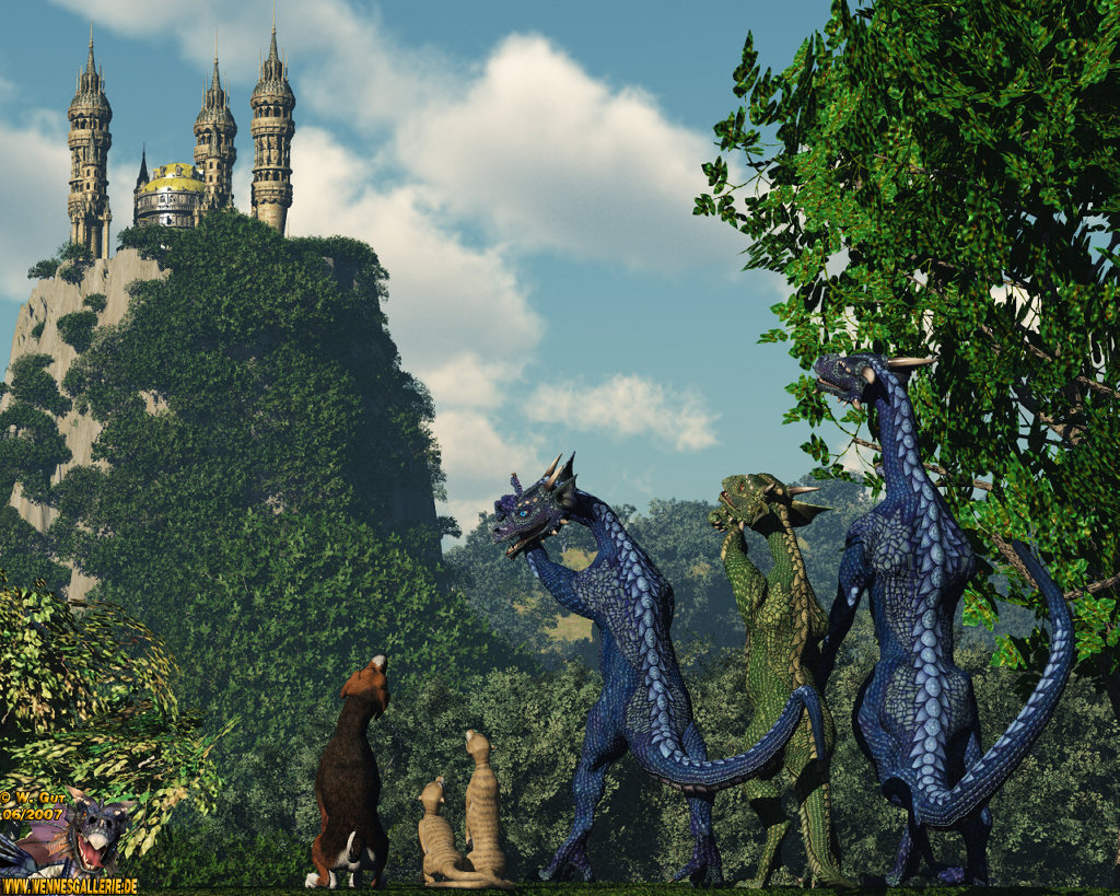Ja, und das Schloß sieht total realistisch aus, wie's so in der Sonne glitzert. Die Drachen sehen auch klasse aus. Aber, was sind das für Viecher, die da neben dem Hund sitzen ? Mungos ?! ;)