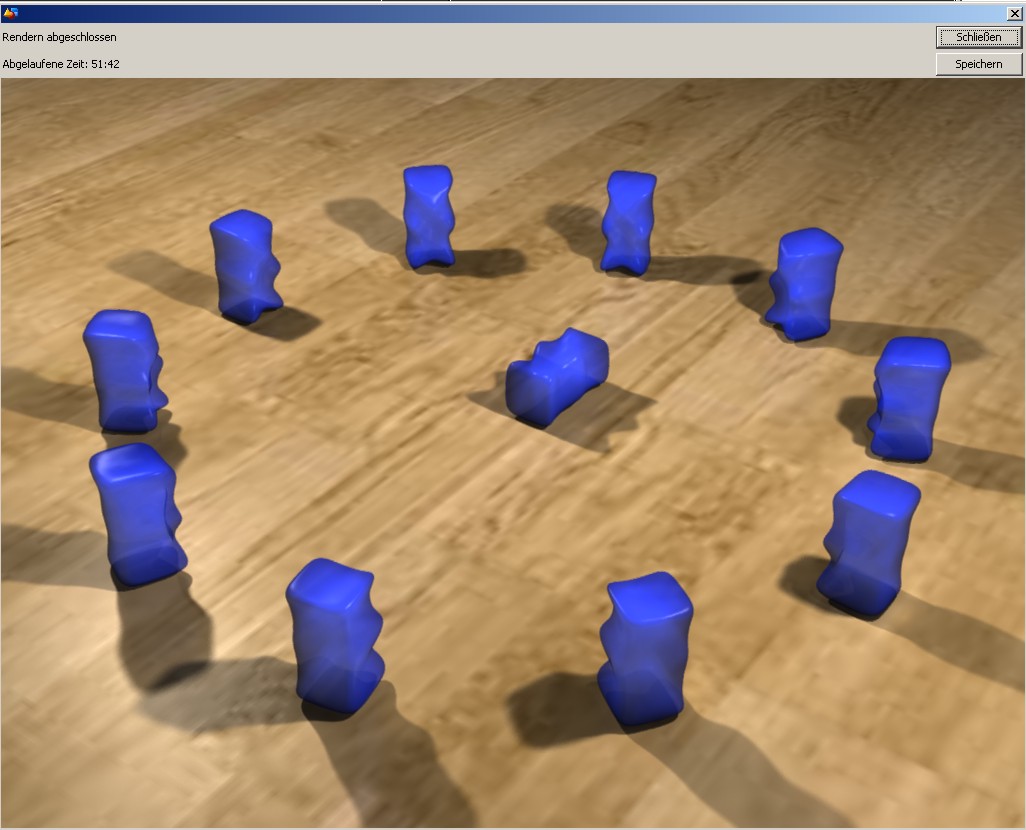 Mit 1024 x 750 und 128 fachem AA , Soft Shadows, Gloss und Subsurfacescattering über Photonenmapping hat es kanpp über 50 min. gedauert - ich habe währenddessen gesurft und getippt.