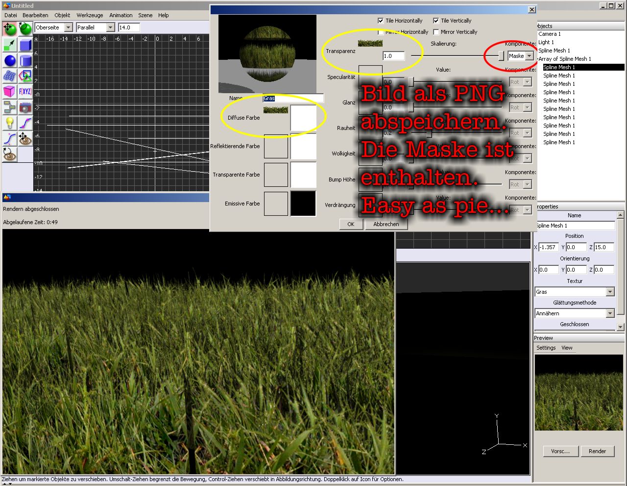 Die verdrehte Version benötigst Du nur wenn Du die Kamera um die Szene bewegen willst.Es gibt etliche Methoden in AoI mit denen man Gras oder ähnliches erzeugen kann (Hair, Fur, TaPD).