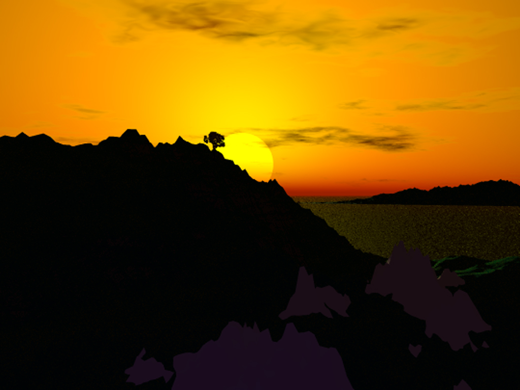 Die Silhouette, der einsame Baum nah bei der Sonne, mir gefällts sehr gut! Was sollen die violetten Formen im Vordergrund darstellen?