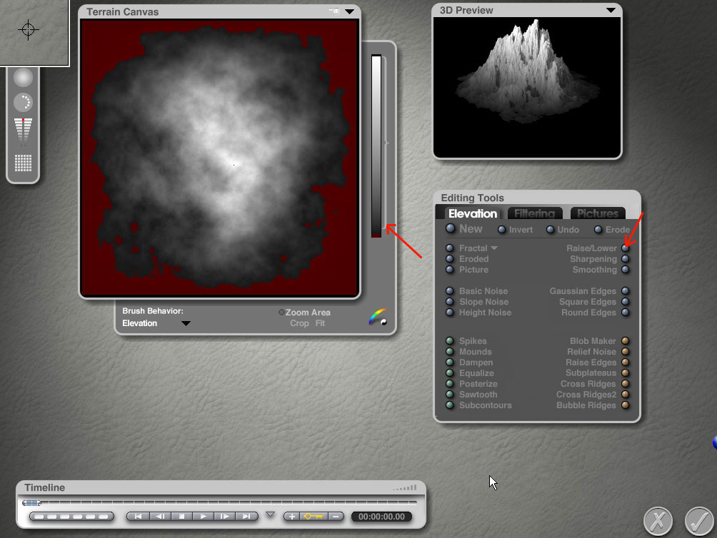 Jetzt das Gleiche nochmal von oben mit der Funktion "raise/lower": (Bild 2 rechts): Knopp mit der Maus festhalten und sachte nach rechts ziehen. Das Ergebnis der vorgenommenen Schritte siehst Du im Vorschaufenster, notfalls mit "undo" zurück und ändern...