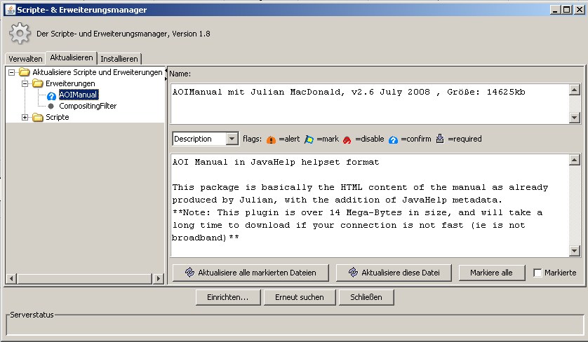 Ich habe die AOIManual erweitering (Plugin) aktualisiert. Es enthält jetzt das neues 2.6 Handbuch und die 2.6 Deutsche Übersetzung auch.