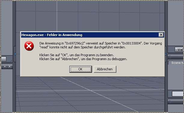 Wenn ich über Button "E" und dann Strng/D ein mesh-Objekt aus Bryce exportiere um es in Hex weiter zu bearbeiten, kackt Hexagon mit einer Speicherfehlermeldung ab (siehe Bild). ![]()