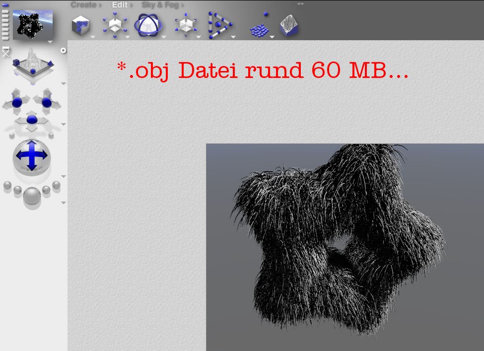 Solch gewaltige obj Dateien enstehen in Cinema auch. Ich habe versucht meine Deckenlampe für Bryce umzubauen. Auf Grund der hohen Polyzahl hab ich es aufgegeben. Die Lampe hätte als Brycedatei weit über 100 MB.