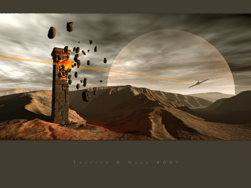 Die herumfliegenden Trümmer sind vielleicht etwas zu statisch. Denke mal, die könnten vielleicht einzelne Rauchfahnen hinter sich herziehen. Das würde das Bild perfektionieren. ![]()
