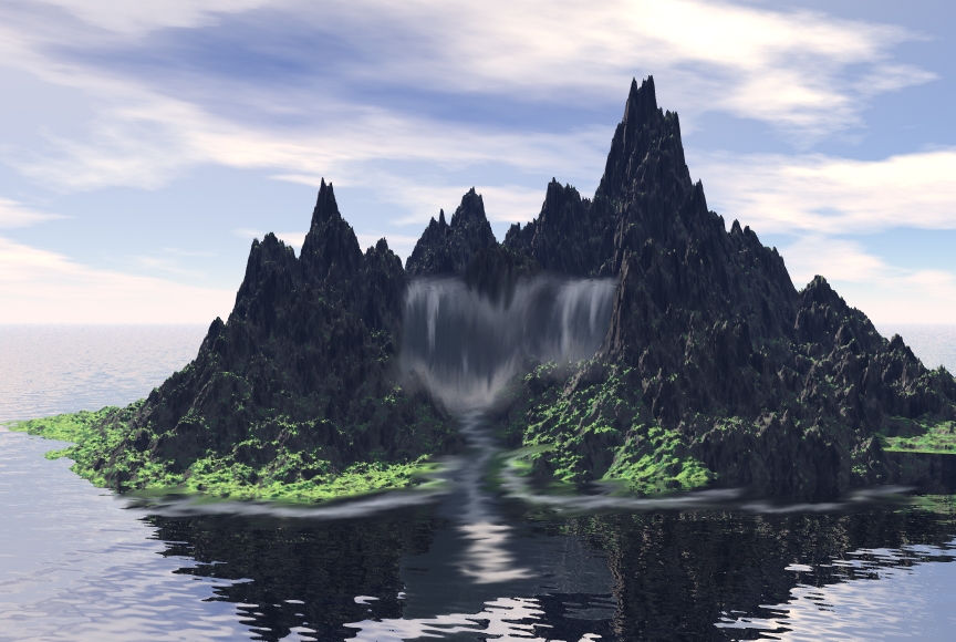 Nur ist das Gelände für die Größe des Wasserfalls noch zu klein. Abhilfe könnten da noch weitere Terrains links, rechts und ein größeres dahinter schaffen. Dann sieht das ganze nicht mehr so aus wie ein kleines Inselchen sondern wie der Ausschnitt einer größeren Küste. Wenn dahinter noch mehr Landmasse zu sehen ist, ist es auch irgendwie logischer dass da vorne so viel Wasser runterkommen kann.