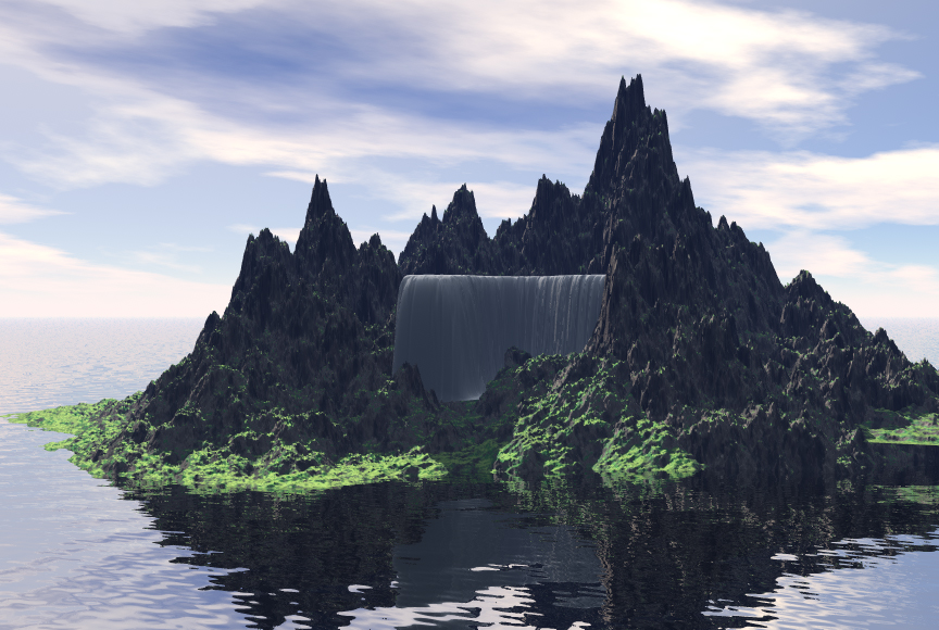 Nur ist das Gelände für die Größe des Wasserfalls noch zu klein. Abhilfe könnten da noch weitere Terrains links, rechts und ein größeres dahinter schaffen. Dann sieht das ganze nicht mehr so aus wie ein kleines Inselchen sondern wie der Ausschnitt einer größeren Küste. Wenn dahinter noch mehr Landmasse zu sehen ist, ist es auch irgendwie logischer dass da vorne so viel Wasser runterkommen kann.