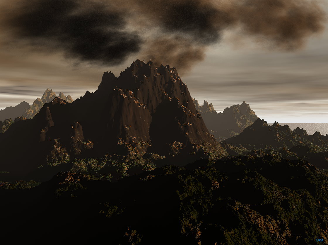 Was man verbessern könnte: Du hattest wie es scheint kein Antialiasing aktiviert. Tu das mal und rendere in der höchstmöglichen Qualität. Der hohe Berg in der Mitte des Bildes hat eine recht weiche Textur, viel weicher als die umgebenden Objekte. Gerade bei diesen vulkanähnlichen Terrains würde sich eine detaillierte, reliefreiche Textur anbieten. Evtl. würde sich noch etwas Vegetation in tief gelegenen Bereichen gut machen. ![]()