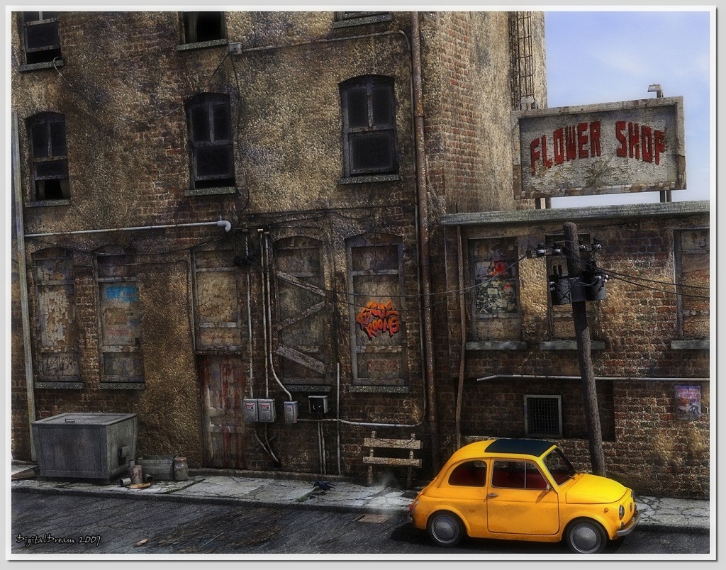 Das schöne, anscheinend neue, gelbe Auto in dieser heruntergekommenen, grauen Gegend find ich klasse! Fehlt jetzt nur noch dass einer im Nadelstreifenanzug aussteigt. ![]()
