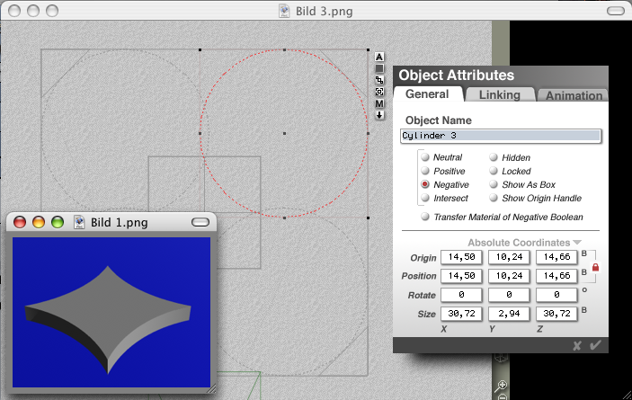 Wichtig ist: Bau das ganze in der Ansicht von oben auf, damit es exakt wird (die Ansicht kann man fix mit Zahlen 123... umschalten). Den ersten Zylinder kannst Du von Hand ausrichten. Dann duplizieren und über die Attribute verschieben (Du musst also nur 3 * die Vorzeichen für x und z anders setzen). Alles markieren und gruppieren. Nun kannst Du dem Ding ein Material verpassen. Die ganze Gruppe duplizieren, die Farbe ändern und es so skalieren (gesamt kleiner danach y größer), dass es die zweite Farbe ergibt. Fertig![Freude :]](https://www.3d-board.de/wcf/images/smilies/pleased.gif)