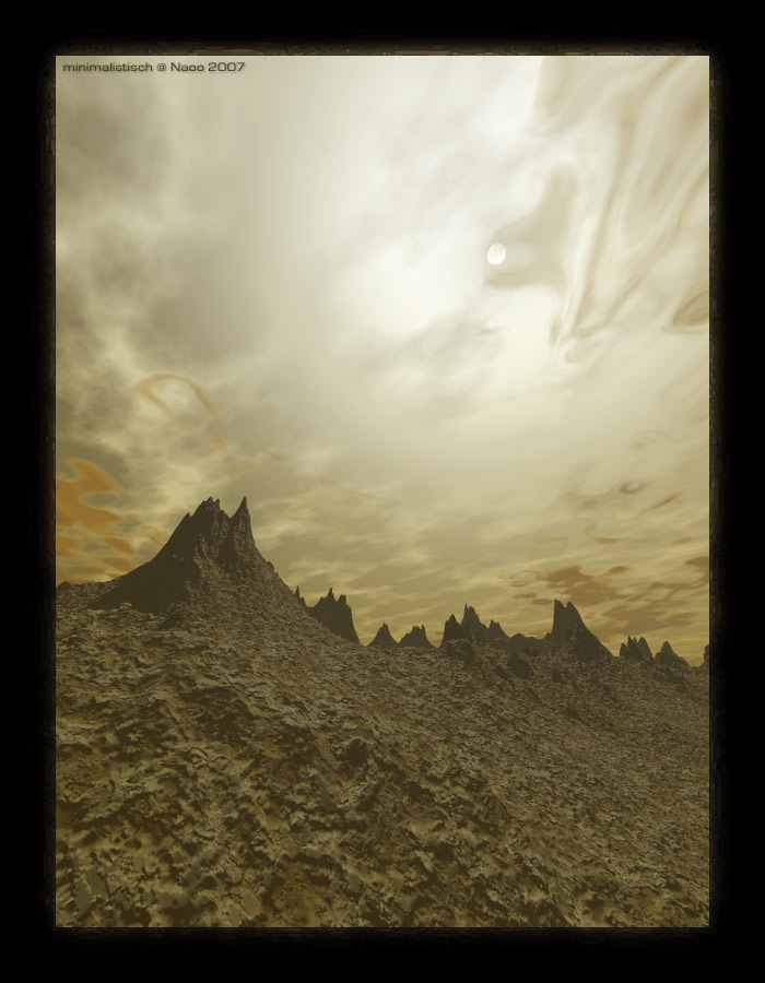 Das liegt unter anderem daran, dass es mit Bryce so wunderbar gut gelingt eine fremdartige Atmosphäre zu erschaffen. Dieses Bild besteht lediglich aus zwei Terrains, sonst nichts. Der Rest sind Einstellungen im Himmel.