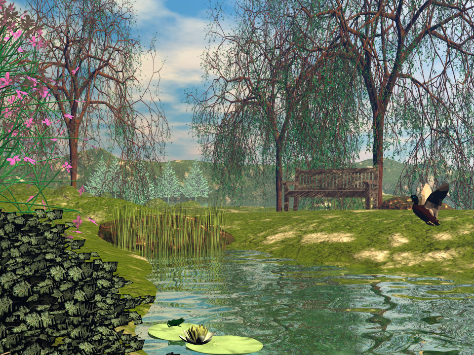 Bryce hat den Nachteil, dass man damit nur sehr schwer realistisch wirkendes Gras erzeugen kann. Damit muss man sich als Bryce-User leider abfinden. Du hast für das Ufer aber eine recht schöne Textur gewählt, die passt ganz gut, finde ich.