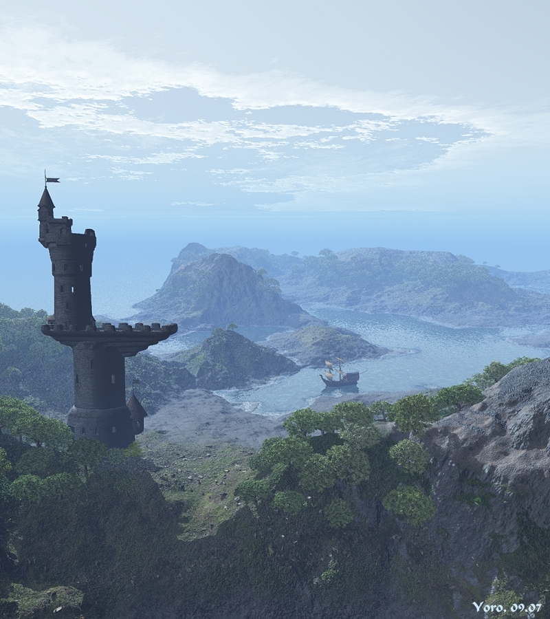 tolles Bild! Mir gefällts auch richtig gut. Die Aufteilung der Landschaft, die Bepflanzung und die dunstig blaue Atmo hamms mir angetan. Nur der Turm will mir persönlich jetz nich so gefallen, vielleicht liegts an der Textur, iss und bleibt aber ne Geschmackssache.