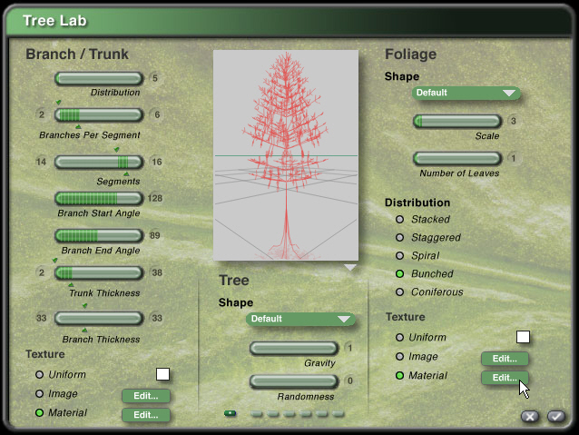 Der Baumeditor von Bryce ist aber wirklich einen näheren Blick wert. Er erzeugt Bäume, die eben keine Meshes sind, sie werden in der Gitteransicht nur im Strichschema dargestellt, und Äste und Blätter erscheinen erst beim Rendern. Dadurch ist die Dateigröße kleiner.