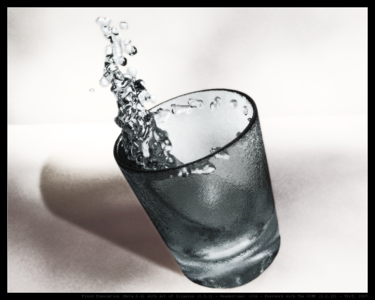 Verwendete Programme: Art of Illusion 2.5.1 (Fluid Simulation Beta 0.6), GIMP