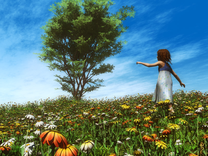 • Noch eine Idee, die mir bei der Betrachtung des Bildes eingefallen ist: Vue hat doch auch eine Windfunktion. Würde sich der Baum etwas im Sommerwind biegen und die Haare des Mädchens im Wind etwas wehen würden (das müßte man wohl in Poser machen), würde das dem Bild mehr Dynamik geben und es vielleicht nochmal ein Stück interessanter machen.