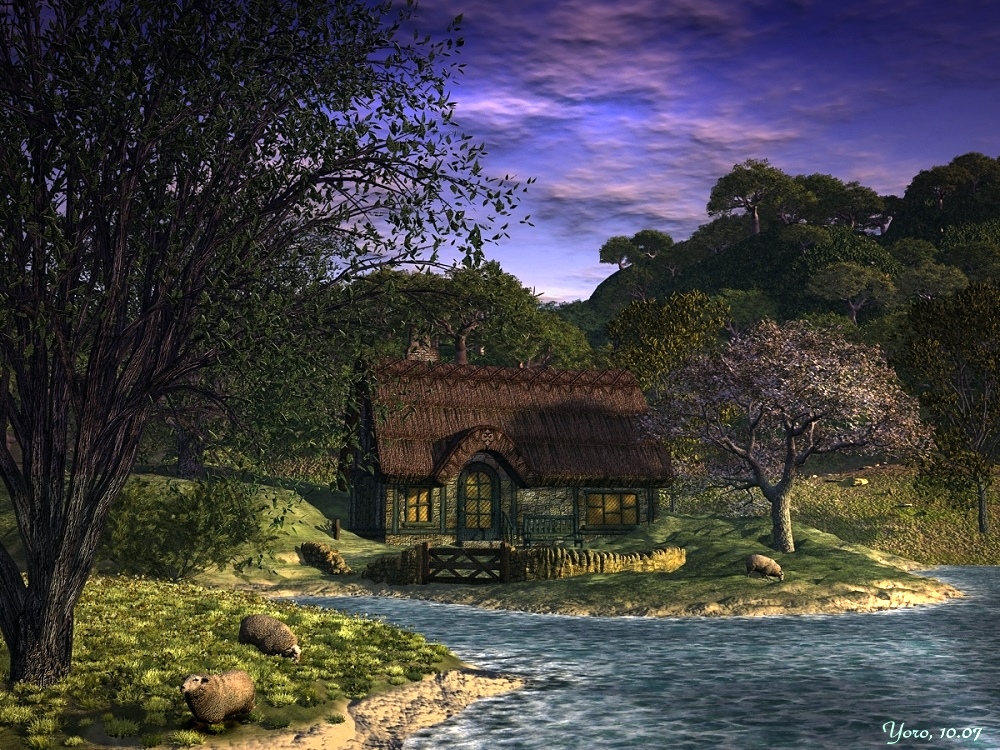 den himmel find ich ein wenig zu knallig. Vieleicht kannst ja noch jemand am fluss angeln oder ertrinken lassen ![]()