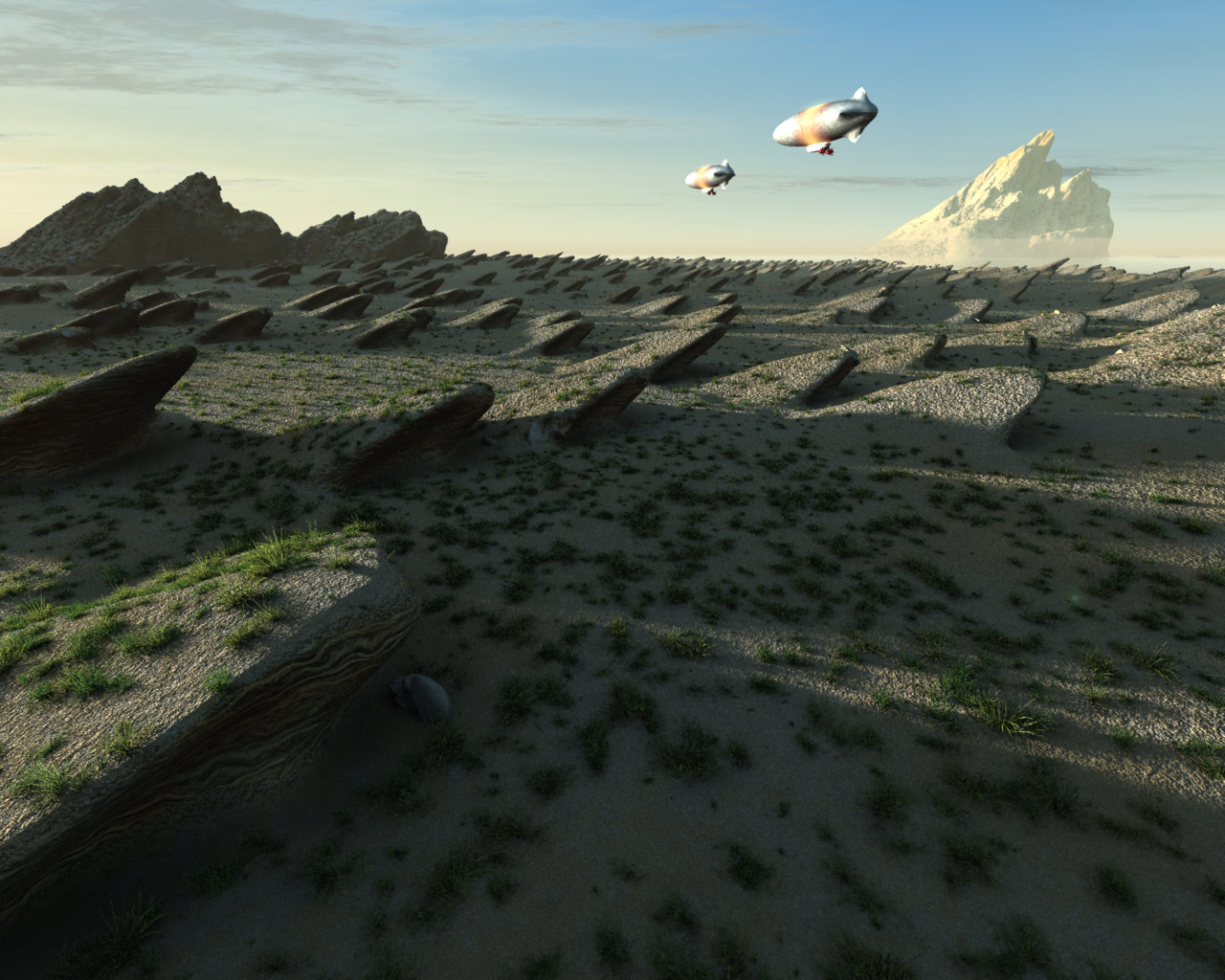 Die"Urviechschuppen" sind kleine Spikes ("Tannen") in einem prozeduralen Terrain, das ich schräg verzogen habe ..... etwas schräg das Ganze eben ...