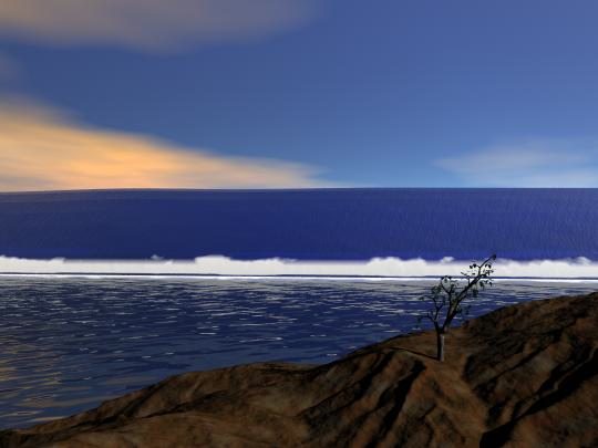 Der Schaum ist gut. Die Wellen habe ich Extrudiert (oder in Bryce vergrössert) dann höhere Kamera Perspektive, fertig! Das durchsichtige Effekt ist recht einfach, ist schon vom Wasserstruktur mit gegeben. Ansonsten musst Du im Material-editor die Transparenz erhöhen. Wichtig ist dabei zu beachten, dass unmittelbar in der Nähe ein Boden vohanden ist, den man durch das Wasser zu sehen bekommt. Der letzte Trick ist der passende Himmel, er muss genug licht haben um den Boden ausleuchten zu können.