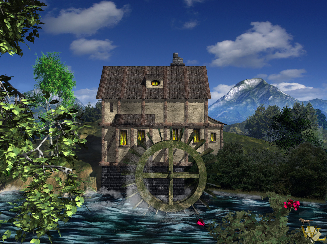 Die Gischt am Ufer, find auch das die gut rüber kommt. Das "aufgewirbelte" Wasser am Wasserrad find ich auch OK, in der 2ten Version kommts aber irgendwie besser :D