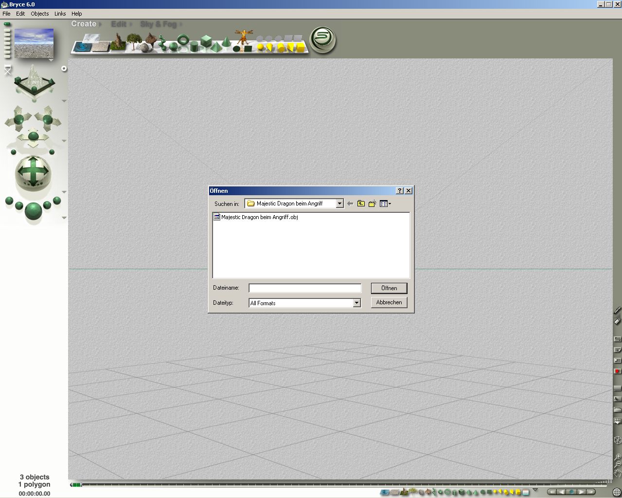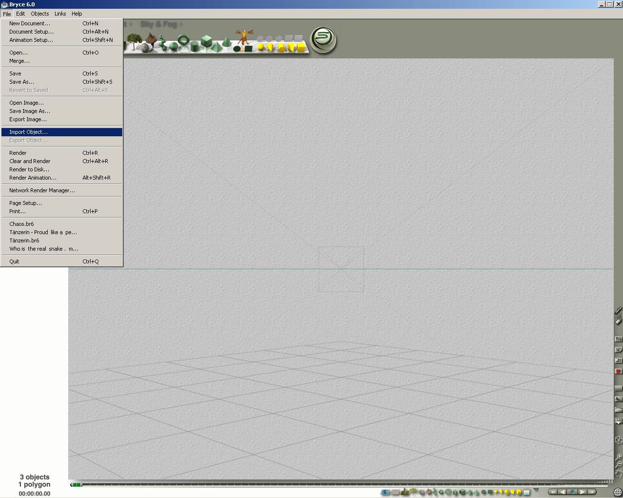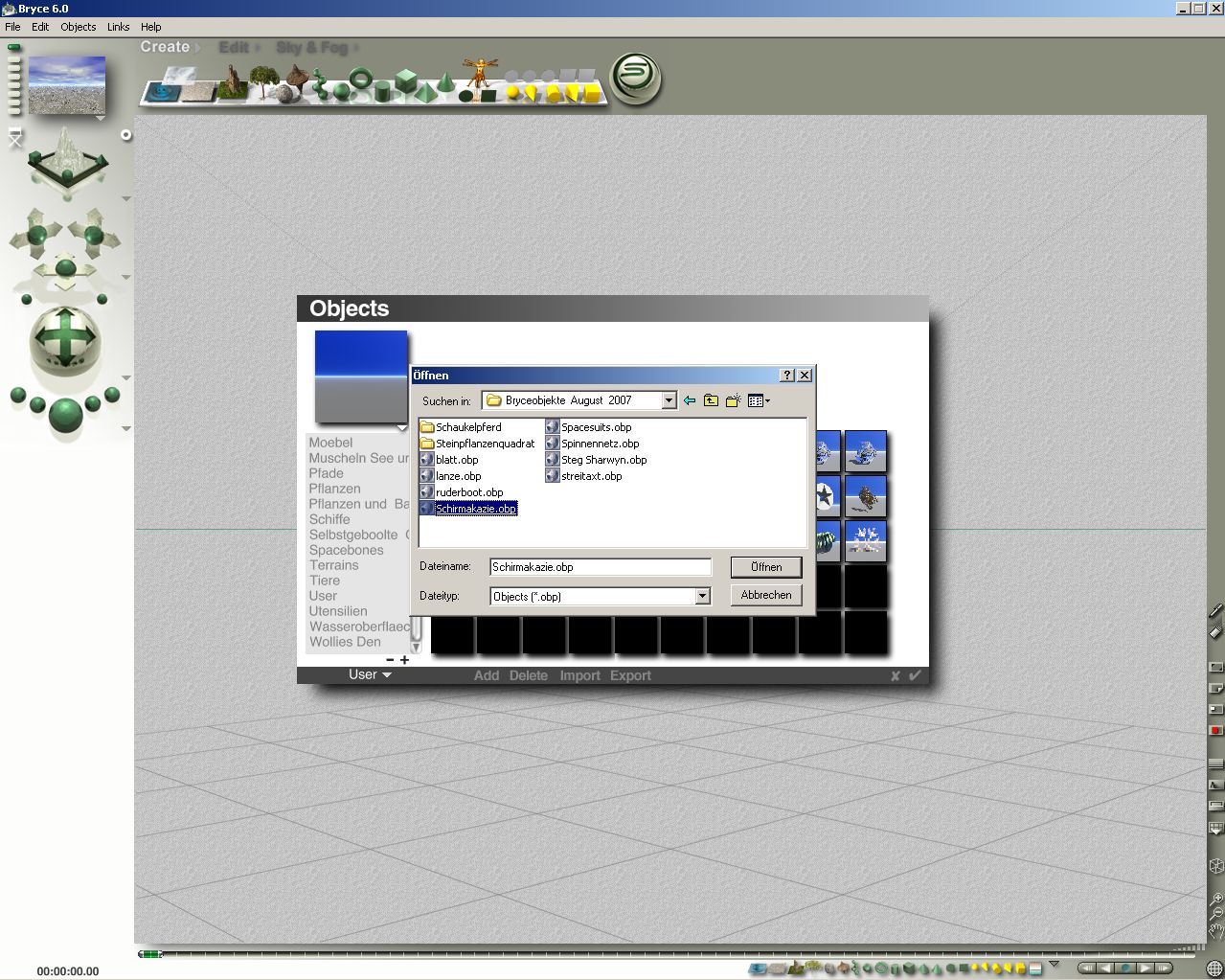 Dann gibt es noch die bryce- eigenen Objekte mit der Endung obp diese werden aber nicht über das Menü hinein geholt ins Programm . Das geht über Importieren direkt unter Objekte . Ich füg mal ein paar shots an .