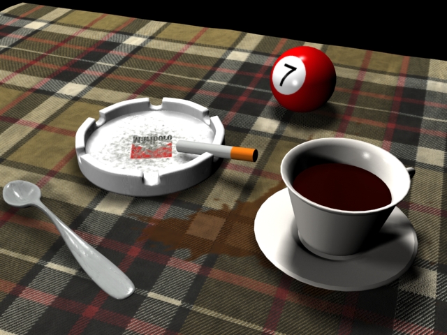 Was man hier sieht...(oder noch nicht sieht :D)...sind einfache Objekte, schnell modelliert (10 min) und wirr ohne Muster platziert. Damit ich die meisten Materialien erwische habe ich mich für einen Aschenbescher, eine Zigarette, eine Billiardkugel, einen Löffel und eine Kaffeetasse mit Kaffee entschieden.