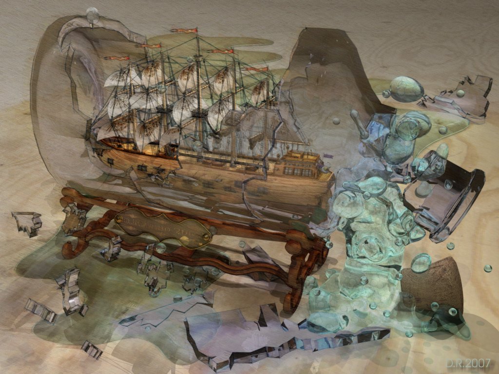 Leider bin ich nicht vor Dir darauf gekommen! Meine Flasche ist noch heil. Sieht dafuer auch langweiliger aus als Deine. Vielleicht wollte der Kapitän Deines Schiffes deswegen auf mein Schiff schießen?
