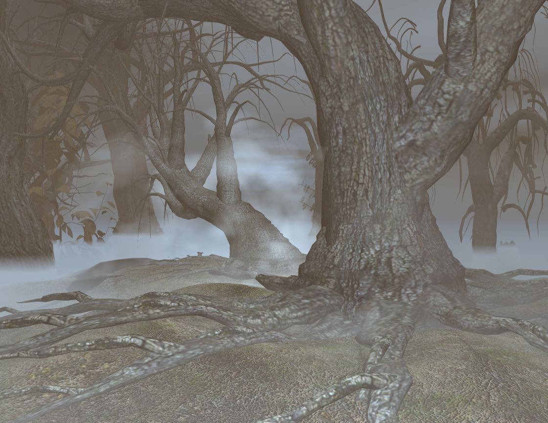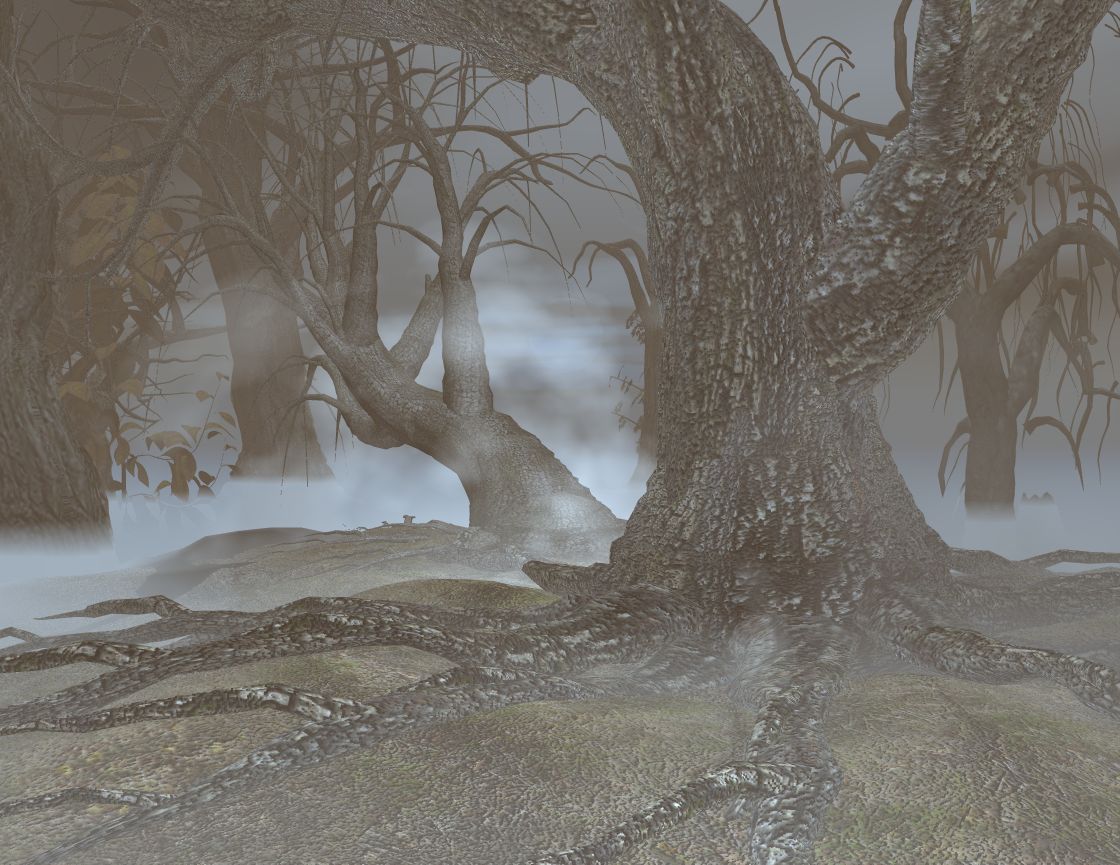 Ich hab das Bild noch mal dahingehend überarbeitet , dass ich dem vorderen Baum mehr Bump zugewiesen habe., damit sie nicht so verwaschen wirkt und man den leicht aufsteigenden Nebel besser sieht. Ich hoffe das ist gelungen.....