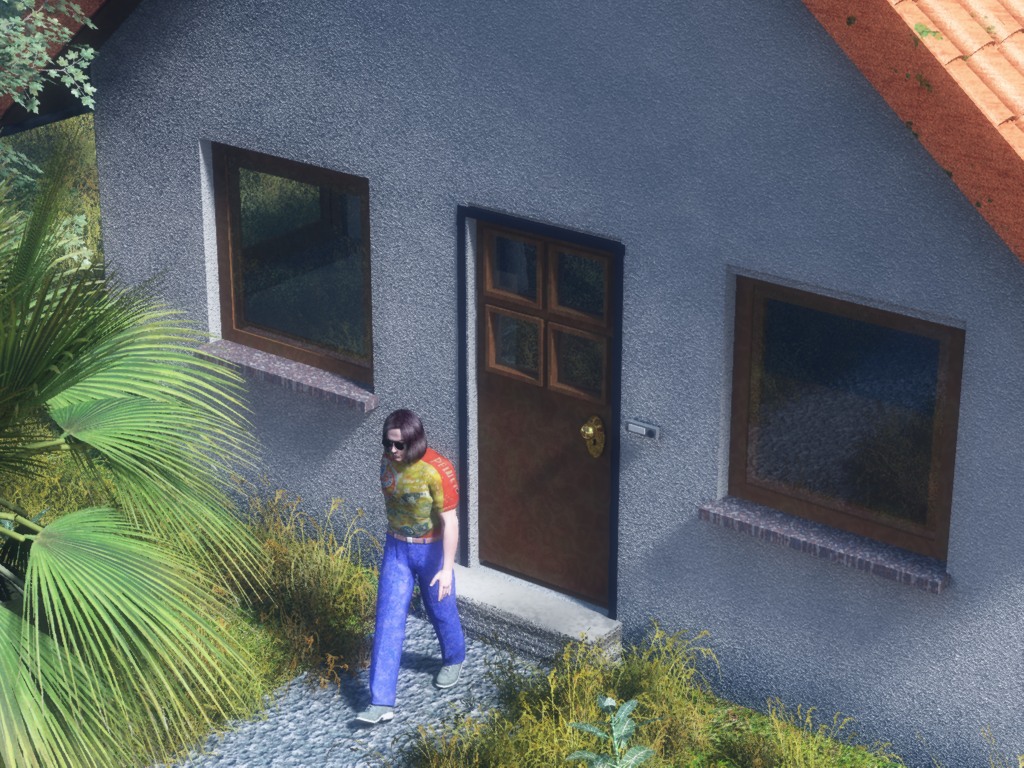 Das sieht ja beinahe realistisch aus. Vor allem das Haus und Garten. Personen sind meiner Ansicht nach das schwierigste, sie völlig realistisch erscheinen zu lassen.