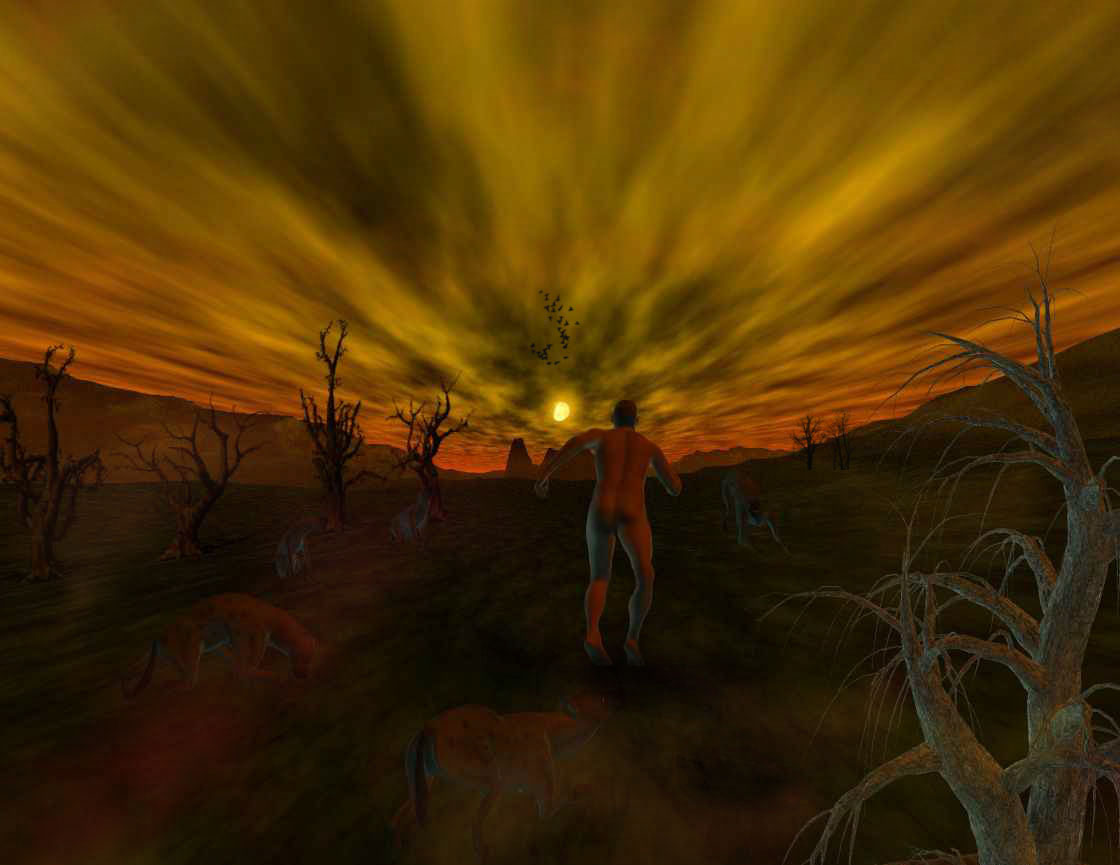 Was auch immer Ihn verfolgt..es ist recht nahe ungefähr beim 1. Busch rechts, bringt ihn gerade zu Fall (Fussstellung) und beleuchtet sein Kreuz...![]()
