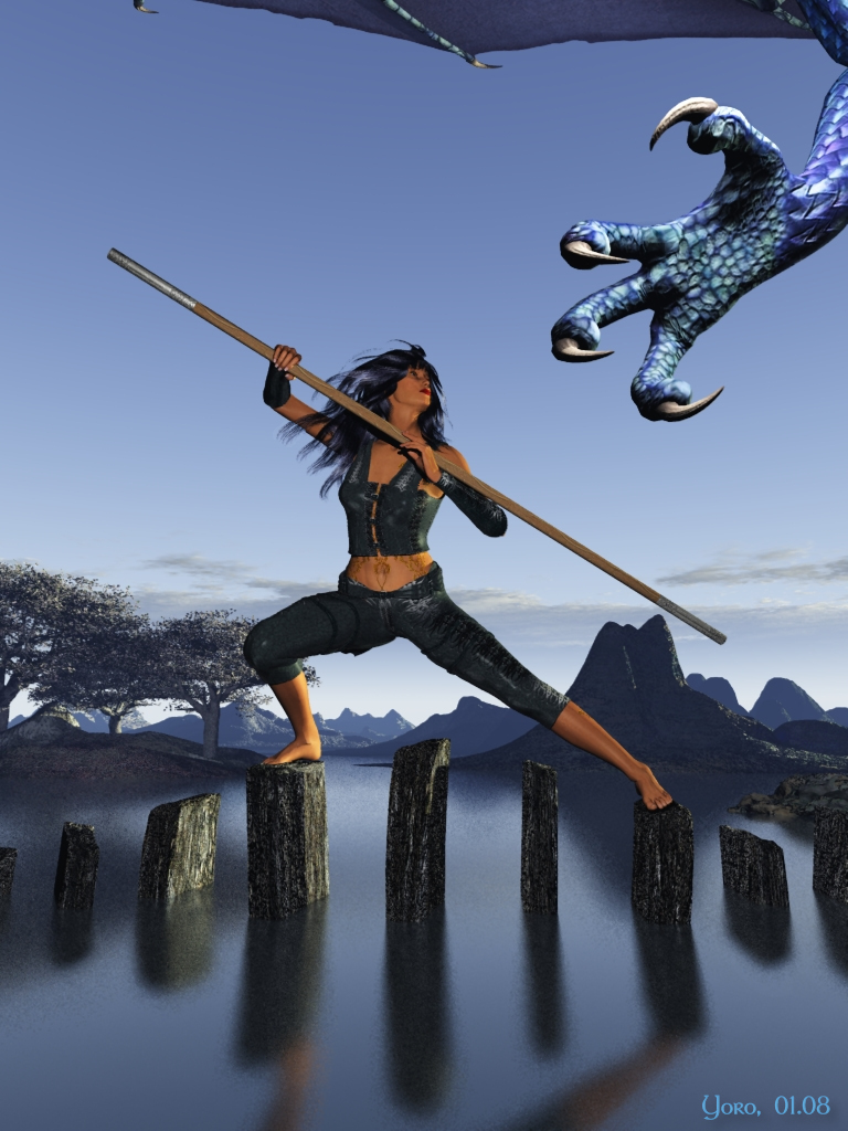Frau & natürlich der Drachen sind Poser, alles andere ist Vue. Minimales Postwork, ich mußte einen kleinen Knick unter dem Arm wegretuschieren (man kennt ja seinen Poser).