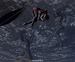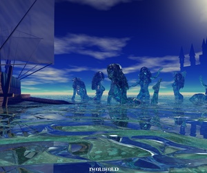 die Idee ist gut, beim linken stört die Textur auf den Körpern doch zu sehr, das Auge hat Schwierigkeiten das Ganze zu erfassen. Schön ist die Umsetzung des "Luft"-Schlosses im Hintergrund. Die Perspektive des Schiffes im Anschnitt ist interessant, aber die Platzierung dort schneidet das Bild ein wenig ab...
