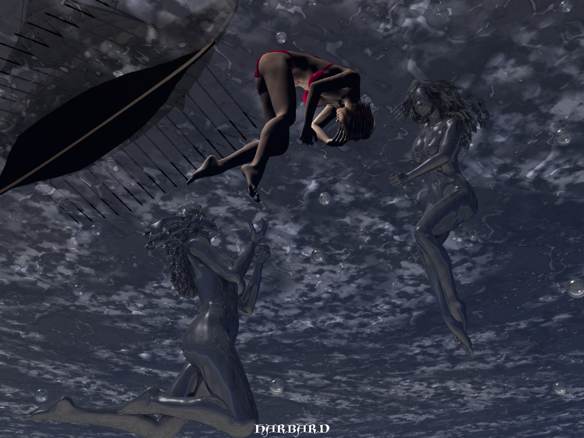 Über die Texturierung / Materialwahl kann man wieder philosophieren. Einzig der Ertrunkenen hätte ich ein fliessendes Gewand verpasst - antikes Schiff und Bikini passen nicht wirklich zusammen.