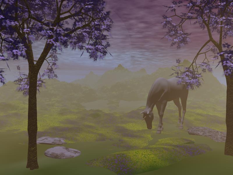 Ich glaube, die Größenverhältnisse stimmen nicht ganz. Kontrolliere einmal in der Seitenansicht, wie Bäume, Einhorn und Berge zueinander stehen.