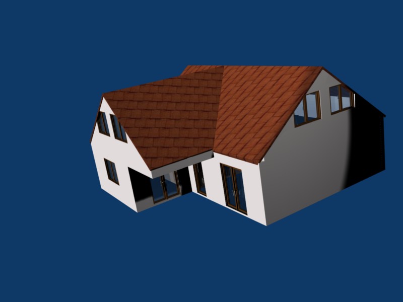 So, mein Haus ist nun (fast) fertig. Das "fast" steht für kleine Fehler, die ich eben entdeckt habe (z.B. unterhalb vom Dach). Die Fehler muss halt noch ausbügeln, mal gucken, wie ich das mach. Die Ausleuchtung und Materialien/Texturen sind auch noch nicht final. Muss da noch lernen.