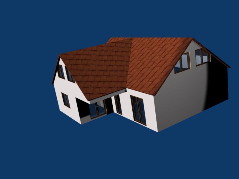 So, mein Haus ist nun (fast) fertig. Das "fast" steht für kleine Fehler, die ich eben entdeckt habe (z.B. unterhalb vom Dach). Die Fehler muss halt noch ausbügeln, mal gucken, wie ich das mach. Die Ausleuchtung und Materialien/Texturen sind auch noch nicht final. Muss da noch lernen.