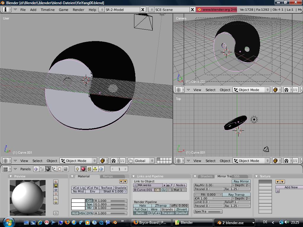 Ich hab mir das Blenderbuch gekauft und hab das Logo-Tutorial gemacht. Habe zwar die Kurven immer noch nicht ganz nach meinen Wünschen hingekriegt (wahrscheinlich weil ich es nicht geschaft habe, die Handles senkrecht zu stellen, soll laut Buch mit G -verschieben- gemacht werden), aber ich habs jetzt wenigstens etwas hingekriegt. Habe dann wie im Tut das Material vergeben, 1xschwarz und 1xweiss. Nur wird bei mir in Blender die weisse Farbe grau dargestellt. Andere Farben werden richtig dargestellt. Das ist auch beim rendern so. Weiss jemand, woran das liegt?