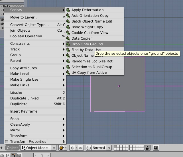 danach werden dann das "ground"-objekt und das objekt, welches auf dem boden plaziert werden soll mit gedrückter [Shift]-taste selektiert und das "Drop Onto Ground"-script angewendet -
