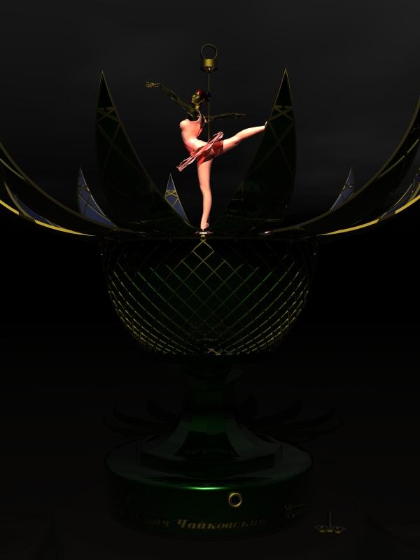der clou bei diesem ei hier : zieht man am ring oben, fächert es sich auf wie eine blüte und gibt die ballerina frei. zusätzlich ist das ei noch eine spieluhr, die man unten mit dem schlüssel aufziehen kann, und bei der sich die ballerina dann dreht.
