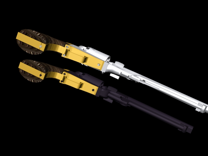 der 1847 Walker,Dragon 1848 ,Army 1860 ,Pocket 1849-1862 ,Texas Paterson etc sowie deren varianten und Nachbauten (leech &Ridgon , Grisworld & gunnison ) sowei Waffen von Remington,Whitney und Starr sowie LeMat sollen folgen ...desweitern habe ich mit einigen bowiemesser der alten Tage begonnen , da gerade die englischen Sheffield Messer mit ihrem edlen Materialien (nur Edelholz wenn überhaupt ,Bein,Horn und Silber, sowei Neusilber als Griffmaterial) zu tausenden in den Westen importiert wurden , aber auch einige amerikanische Messer mit dem etwas einfacheren Design , und den verwendeten Materialien wie Eisen und Messing kommen noch dazu ..bei den texturen muss ich noch etwas arbeiten , und ein paar kleine Fehler müssen noch entfernt werden ..zb die schraube unten am griff weiter nach vorn :)