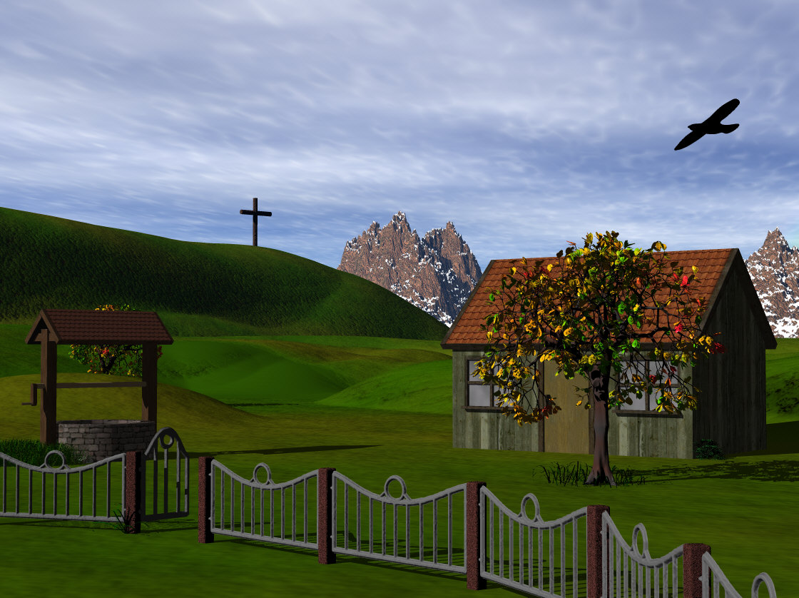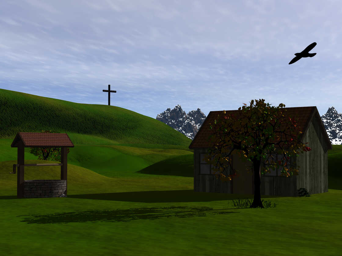 Das gesamte Licht könnt nen Tacken heller, die Berge im Hintergrund ein wenig höher - und wenn Du noch hier und da ein paar höhere Grasbüschel verteilst (speziell um den Brunnen rum) isses perfekt! (Grasbüschelmodelle gibt`s reichlich zum freien Download - hier im DL Bereich sind auch welche...)