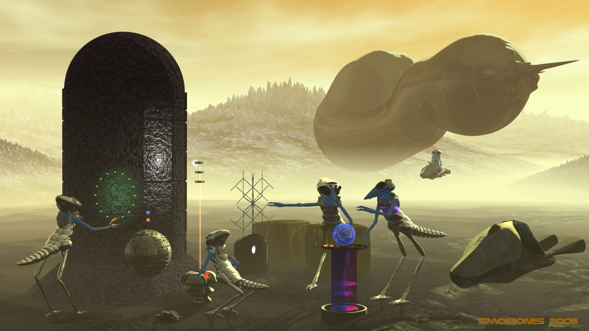 Das war eine Szene die ich an meinem alten Rechner nie fertig bekommen hatte ( 22 Millionen Polygone...:P ) Die Figuren waren geboolt, Gliedmaßen mit Metaballs, Anzüge teilweise in shapemagic erstellt etc. - Bryce 5 halt...