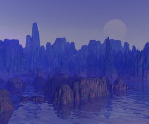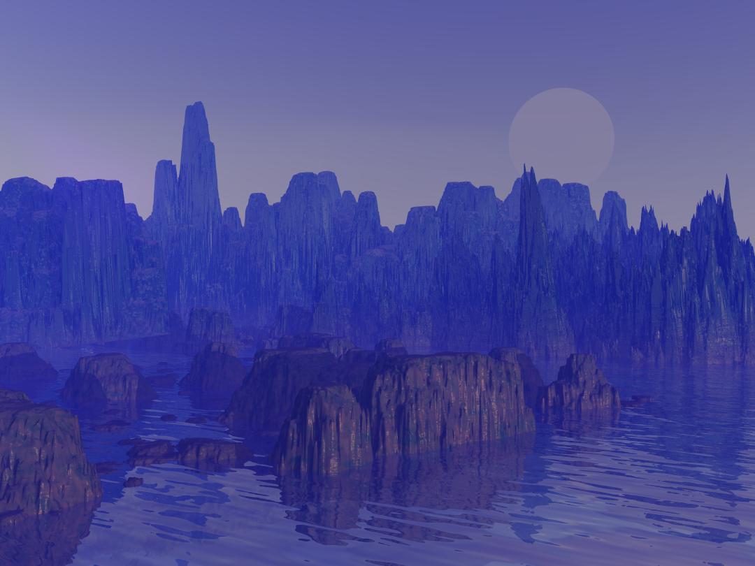 Dass die Felsen vielleicht etwas klein wirken kann daran liegen dass die Grösse der Wasser-Oberflächentextur eher für den Nahbereich voreingestellt zu sein scheint. Selbige etwas runter skalieren und schon isses okay...
