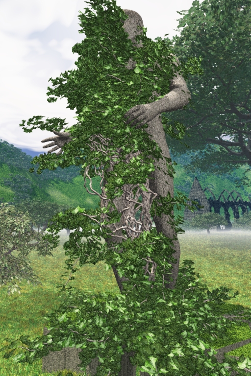 Fernerhin wirst Du beim Import von Bryce evtl. nach dem Pfad für das fehlende ".mat" File gefragt, welches normalerweise zu einer .obj Datei mit dazu gehört. Wenn Ivy Generator beim Export des Efeus kein mat file geschrieben hat (was bei mir die Regel war) sagst Du einfach "abbrechen" und Dein Efeu wird problemlos -halt ohne Textur- importiert. Danach kannst Du den Komponenten "branch" (Stamm), "old leaf" und "young leaf" (altes und junges Laub, sind nach Import gruppiert) einzeln die gewünschten Texturen / Materialien zuweisen...