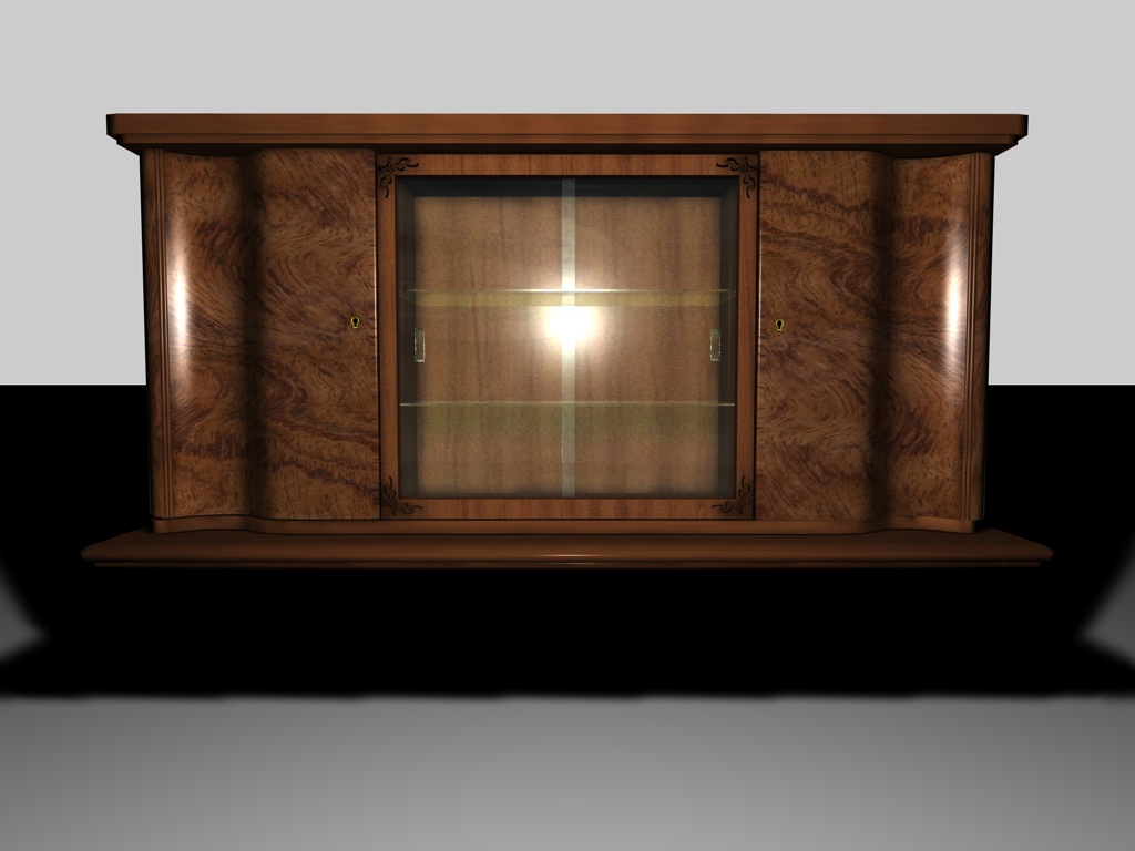Anstelle der Vitrinen gibt's bei uns eine Doppeltür - alles in Wurzelholz - und an der oberen Kante sind durchgehend Ornamente eingearbeitet. Aber, verflixt und zugenäht, ich kann mich einfach nicht erinnern, ob die Deckplatte auch aus Holz ist oder ob sie in dunkelgrau mit weiß geädertem Marmor ist ... davon haben wir nämlich auch einen.
