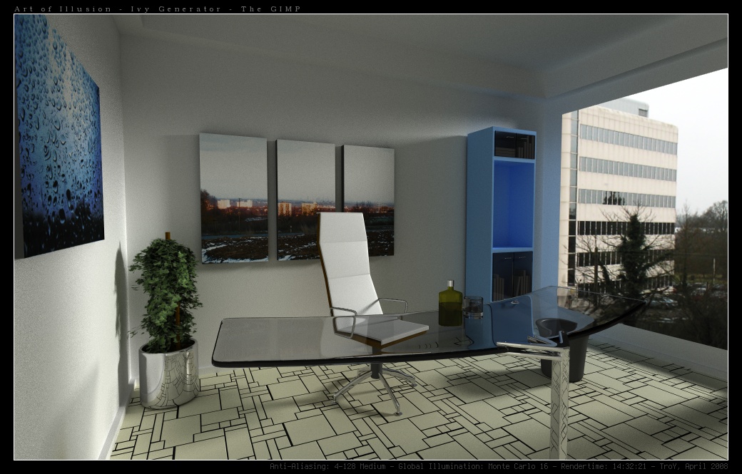Hier mal der Versuch, einen halbwegs modernen Büroraum mit sanftem Licht zu basteln ...