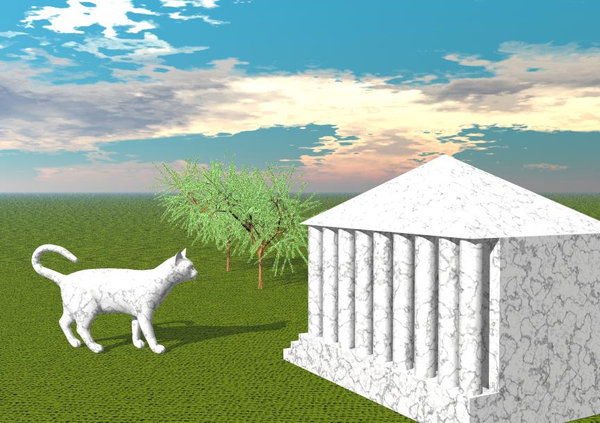 Folgende Vision: Ihr steht auf einer großen Wiese. Um euch herum nur Gras und der Horizont. Ihr steht neben einem alten, girechischen Tempel und neben euch eine große Skulptur. Ihr seht vorm Tempel fort und eure Augen folgen einem schmalen Weg, an dem nur ein paar Bäume stehen.