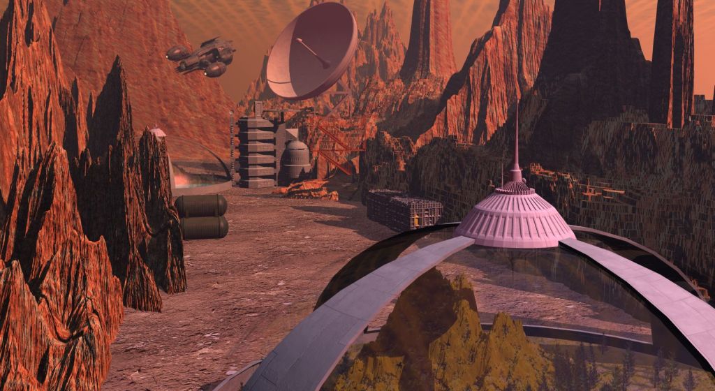 So könnte ich mir eine Bergwerks-Kolonie auf einem fremden Planeten vorstellen. Eine Tunnelröhre oder Magnetschienen Bahn zwischen den Kuppeln würde sicherlich auch sehr gut rein passen. - Aber meinst Du nicht, dass zumindest die Satelitenschüssel etwas Überdimensioniert ist - so im Vergleich zu der Kuppel mit dem Wald im Vordergrund?