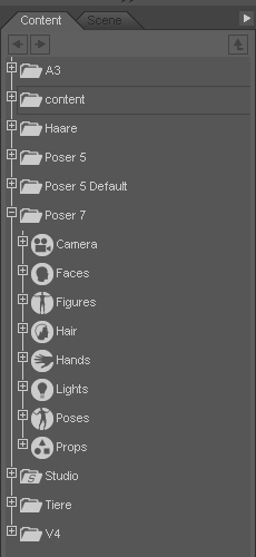 In einem frisch installierten DAZ|Studio werden im Content-Tab zwei ordner angezeigt "Content" und "Studio". Der da Angezeigte "Content" Ordner beinhaltet alles was in dem Verzeichnis "C:\Programme\DAZ\Studio\content\Runtime" im Poser-Format / Hierarchie abgelegt wurde. Während der Ordner "Studio" die DAZ|Studio Formate des Ordners ""C:\Programme\DAZ\Studio\content\" beinhaltet.